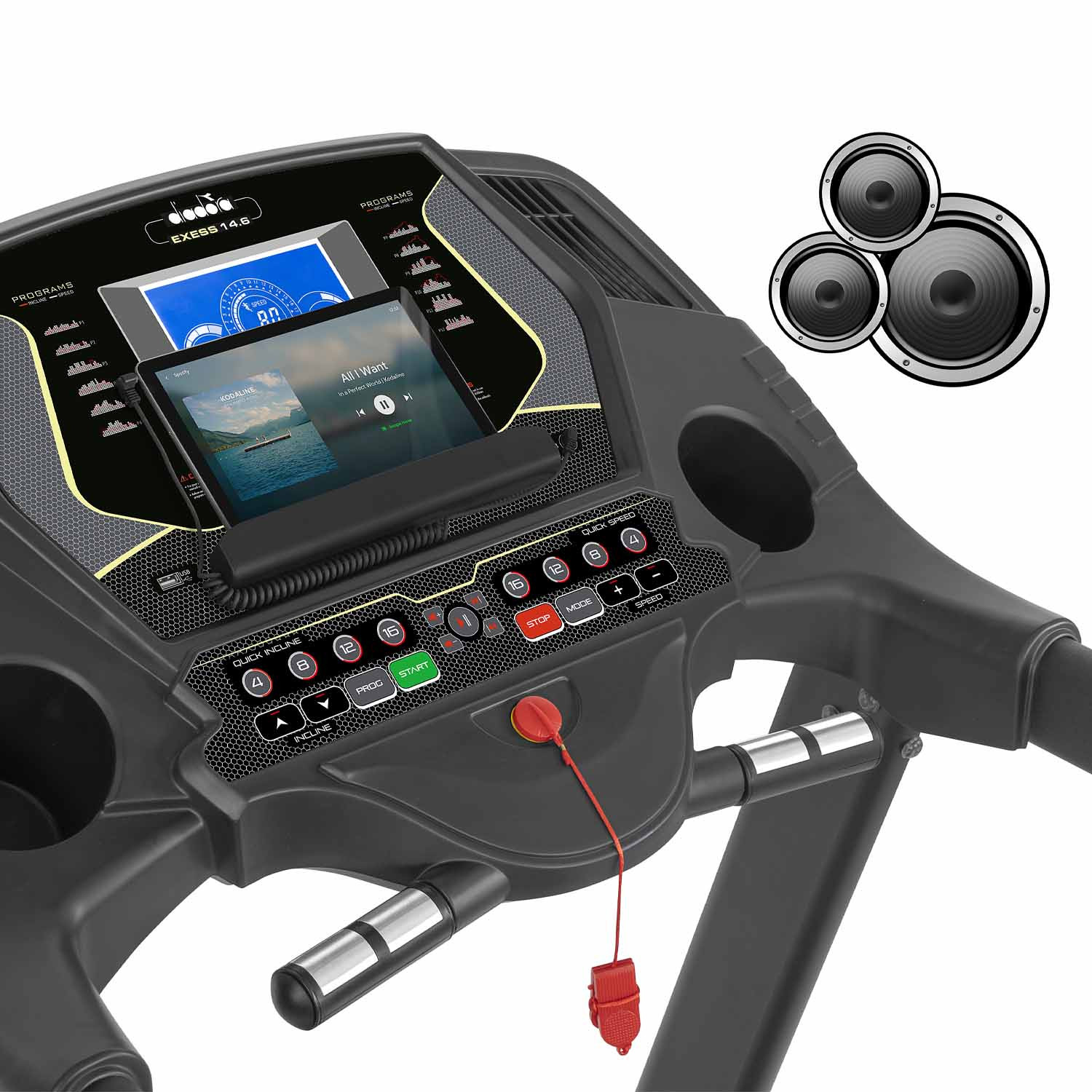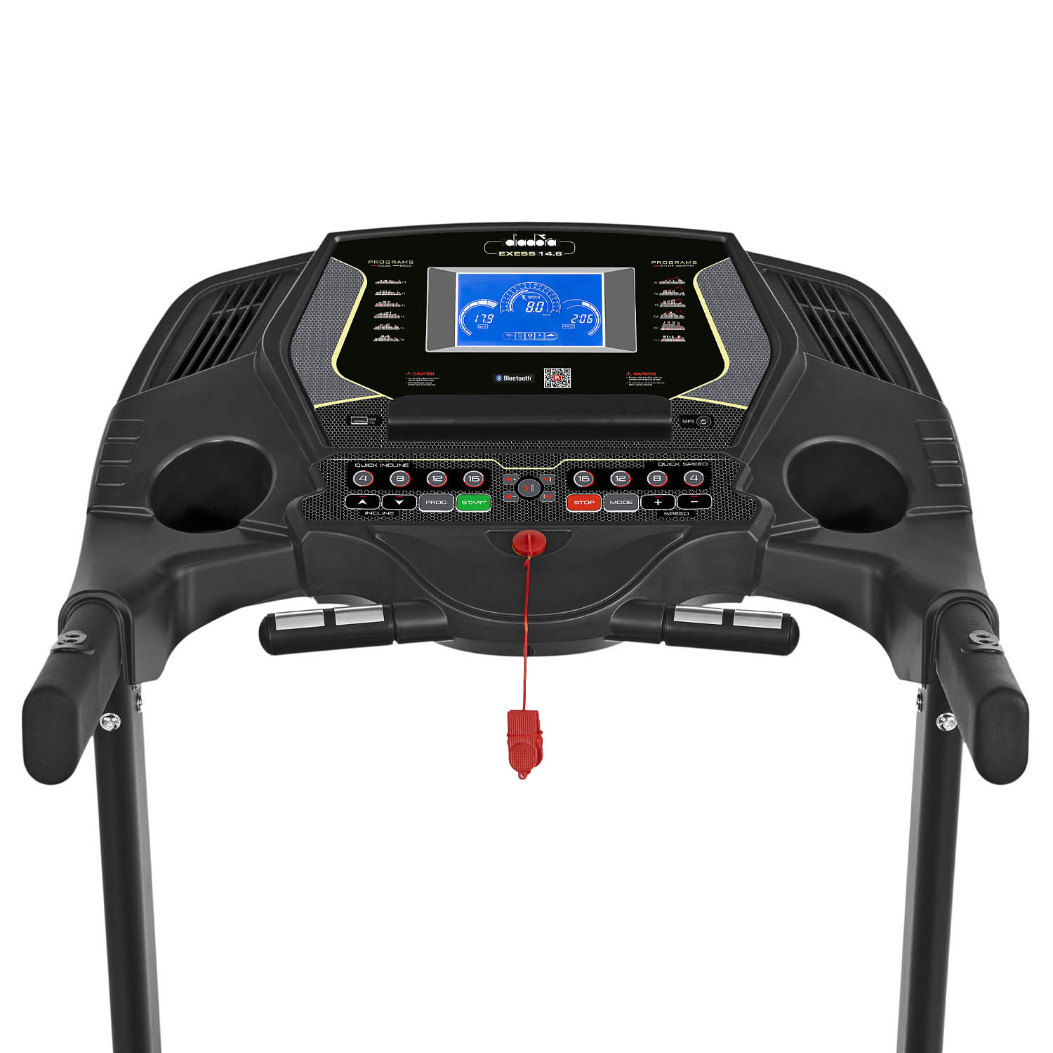 La console è provvista di porta tablet, altoparlanti integrati con presa MP3 e ingresso per chiave USB. Anche le dimensioni di Exess 14.6 garantiscono un esercizio performante anche per i più allenati. La superficie di corsa misura infatti 58×150 cm e il motore da 3,5 hp permette di raggiungere una velocità di 22 km/h. Il piano di corsa, ammortizzato con ben 8 elastomeri, è inclinabile elettricamente fino al 20%.