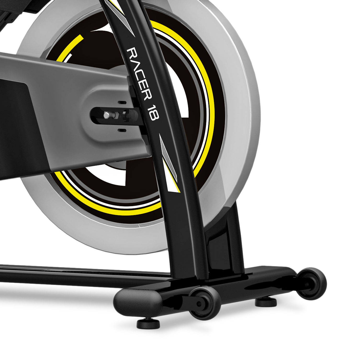 La resistenza è regolabile a tampone con sistema di frenata a pattino, e la trasmissione a cinghia garantisce un funzionamento silenzioso. La sella e il manubrio sono regolabili per un comfort personalizzato, mentre i pedali racing (con opzione SPD) assicurano una pedalata sicura. Facile da spostare grazie alle ruote di trasporto, la Racer 18 è stabile su qualsiasi superficie grazie ai piedini di livellamento.