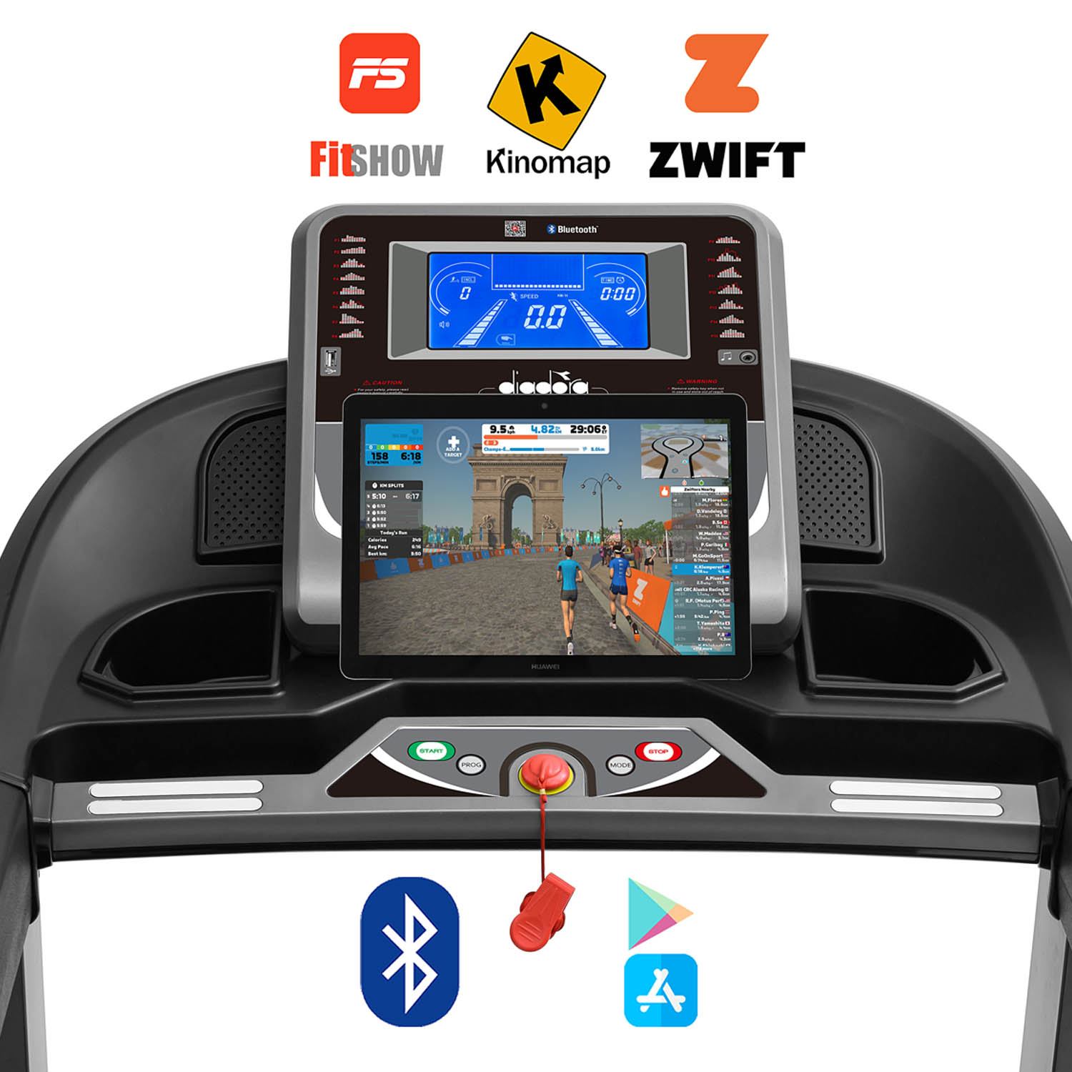 Con Bluetooth colleghi Kinomap, Fitshow, Zwift: percorsi reali, mappe, coaching, community e storicizzazione dei dati trasformano la seduta in un’esperienza interattiva. Il display 16×9 cm mostra i parametri chiave; sensori palmari, ricevitore wireless e fascia toracica danno un controllo cardio completo, fondamentale negli HRC. Speaker MP3, USB e jack portano musica e podcast a bordo, mentre il supporto tablet posiziona lo schermo all’altezza giusta. Obiettivo: più varietà e meno noia, così rimani in zona utile più a lungo. Vedere ritmo, pendenza e battito in tempo reale, con grafici e segmenti app, rende il lavoro consapevole e divertente. Allenarsi diventa un appuntamento: motivazione alta, progressione lineare, risultati che restano.